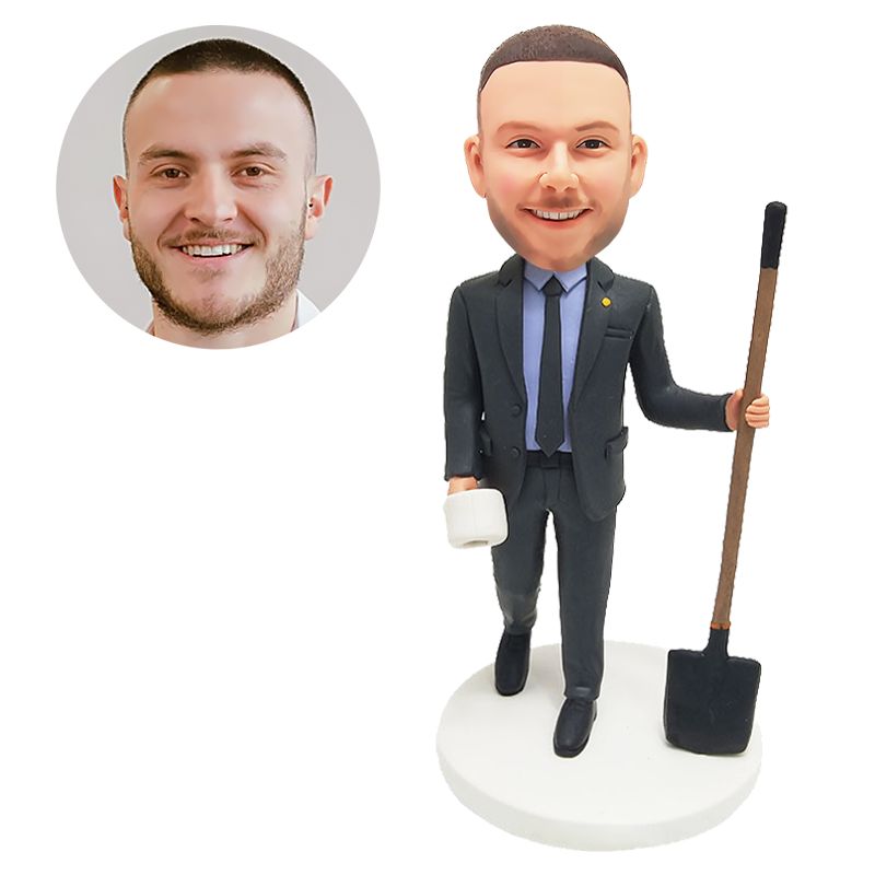 custom bobble head figure male boss holding a shovel and a roll paper