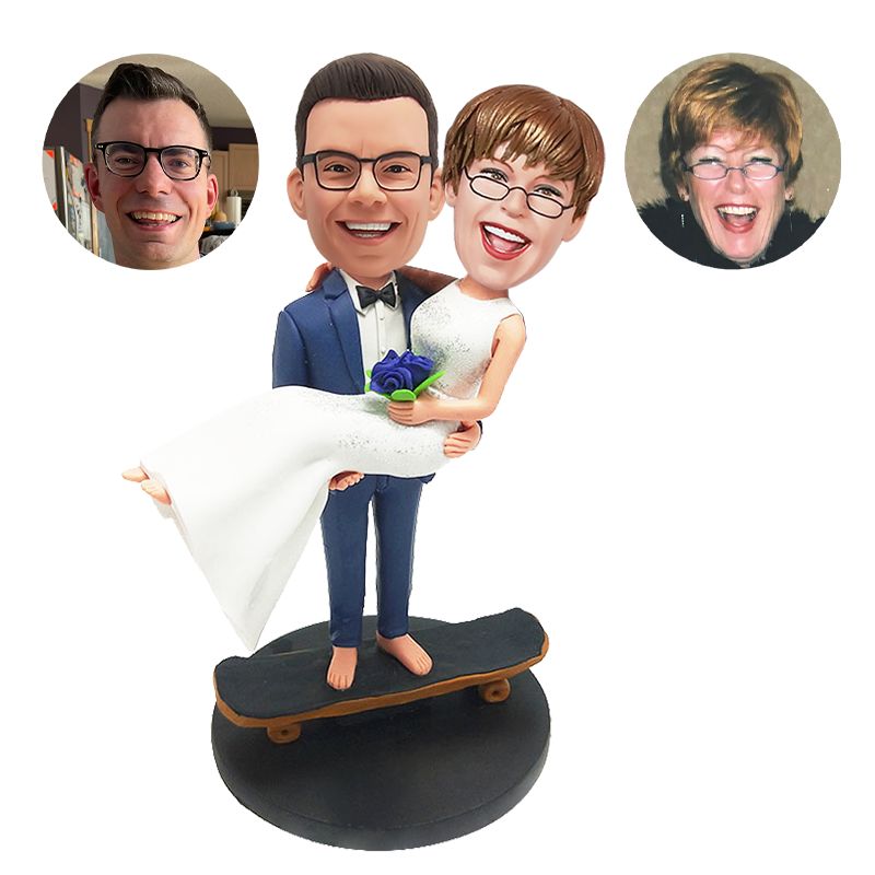 custom made bobble heads figures wedding couple carrying the bride on the skateboard