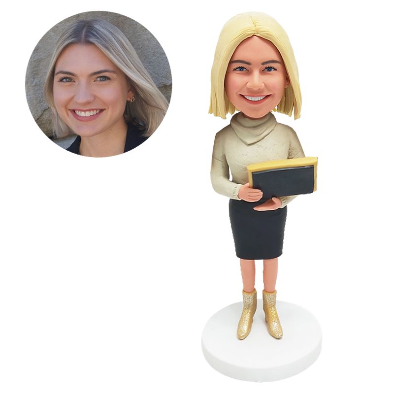 custom made bobblehead female teacher holding a black board