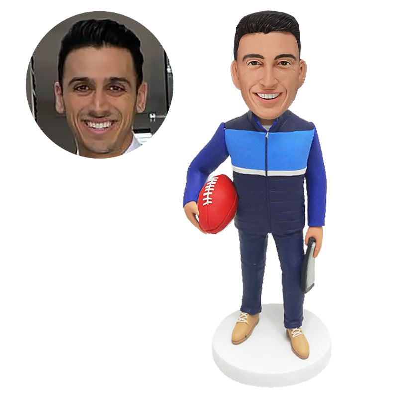 customised bobble head figure male coach holding a noteboard and a football