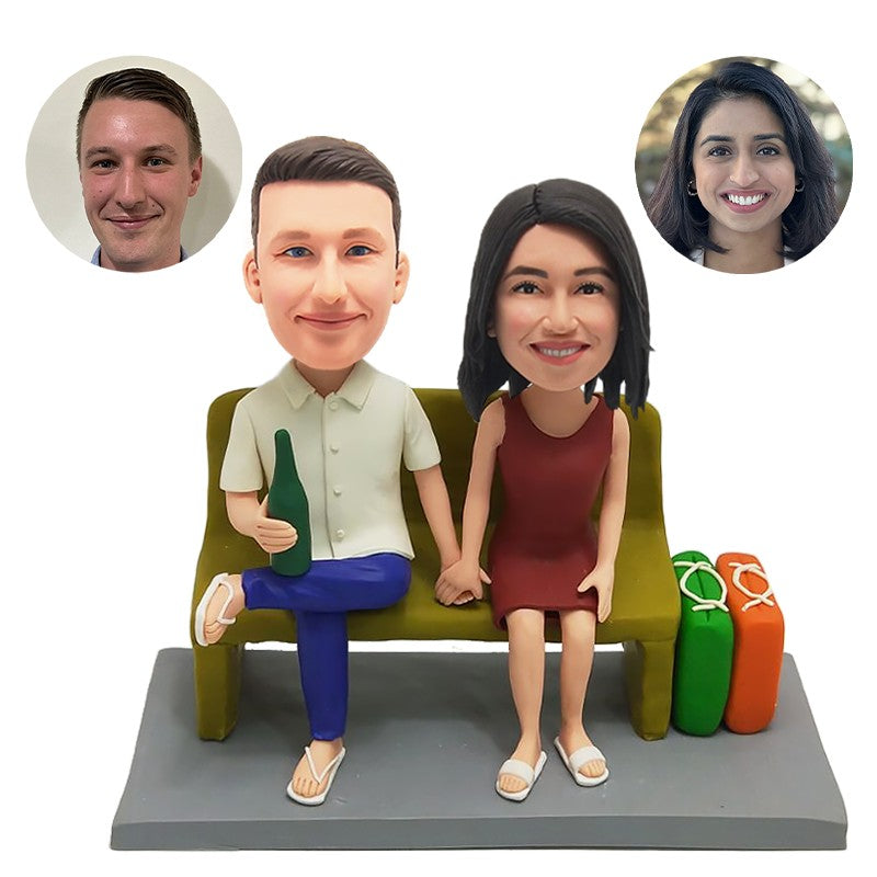 customized bobbleheads figures happy couple holding hands with suitcases beside