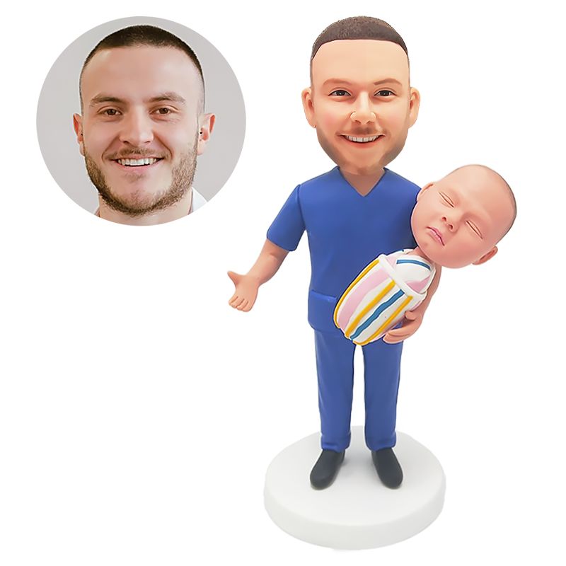 personalised bobblehead nurse figure gynecologist male doctor holding a baby