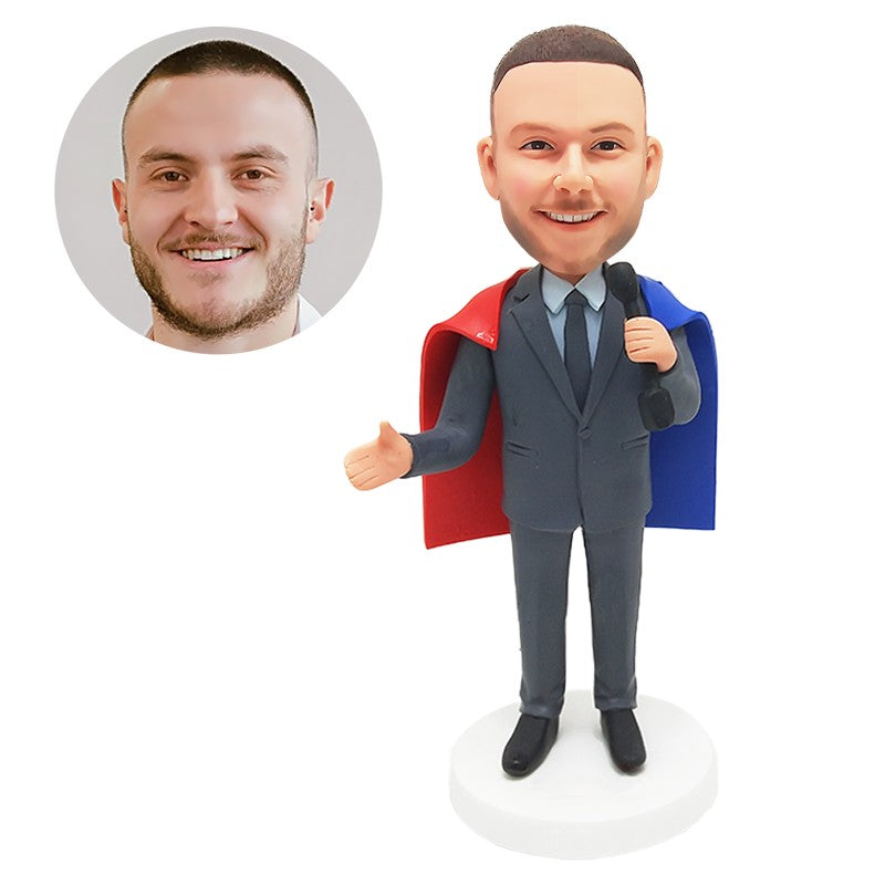 personalized bobblehead figurine businessman wearing a cape holding a dumbbell