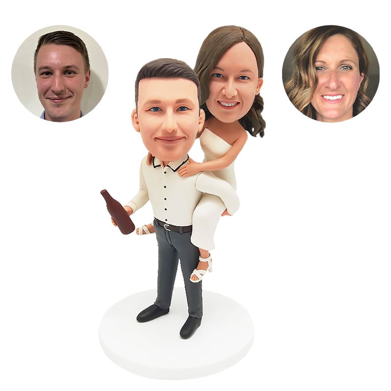 personalized piggyback bobbleheads figures couple man carrying woman on back with a beer